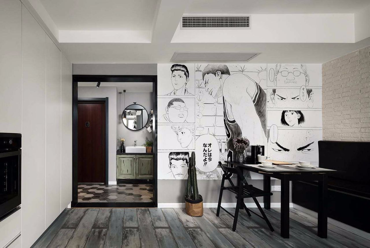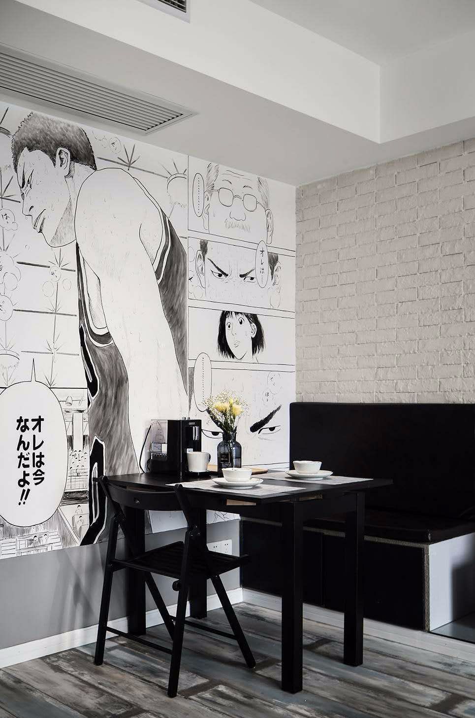 由于朋友喜欢灌篮高手,于是将整面墙都绘画上了,这是特意找的美术学院的老师来绘画的,真的非常生动,也让我着实羡慕呢!餐桌椅选择的是黑色系,与白色的墙壁形成对比,在视觉上有提亮整个空间的作用