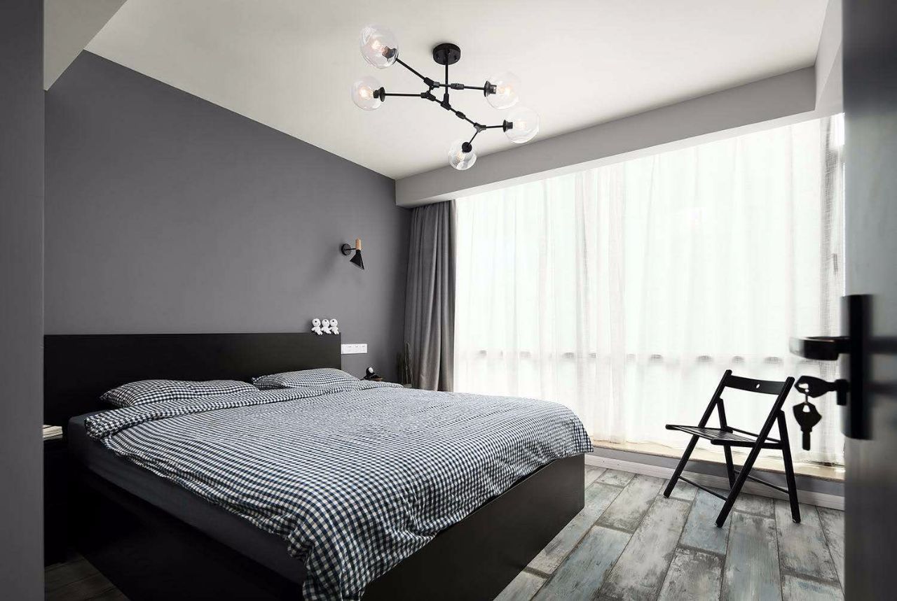 主卧给人最大的感受就是安静,整体选择的是冷色调,床和床头头柜都是选择的黑色系,但是在一些可爱小物件的点缀下,再高冷的范儿都让人觉得温馨舒适!深灰色的墙面与超大的落地窗相互映衬,不会使得整个卧室空间单一又耀眼,相互平衡,很有感觉!