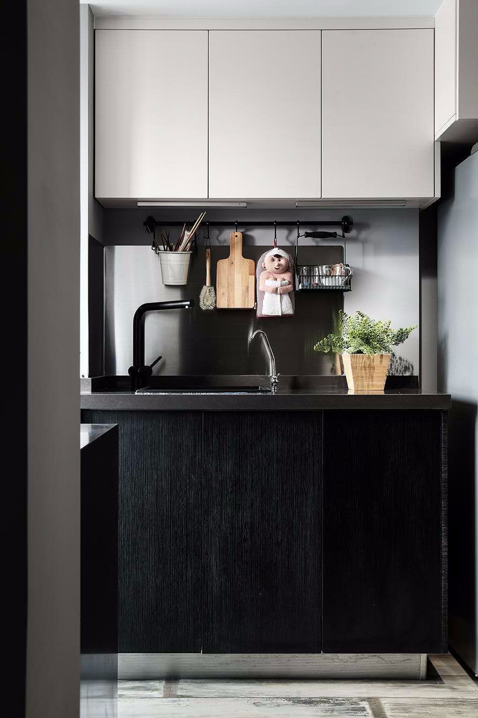 沙发的背后是过道区,由于面积不是很大,朋友又不喜欢过于繁复的设计,于是在此处做了整面墙的收纳柜,而且嵌入了一个小小的西厨和冰箱,小小的空间顿时发挥了大大的作用