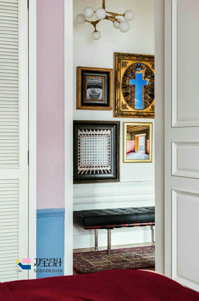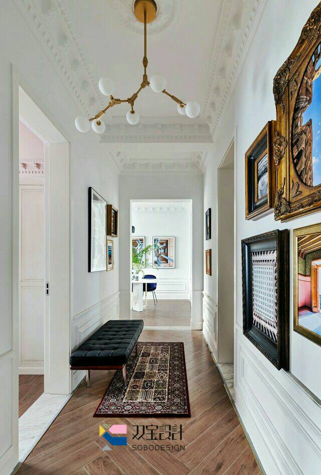 过道:对于储物已经在其他空间得到了满足,所以设计师做了一个画展兼并摄影展的展示区域,保留了过道空间宽度的同时,也加入了一些后现代与上世纪欧洲老画框的碰撞,让空间有了它独有的故事性。