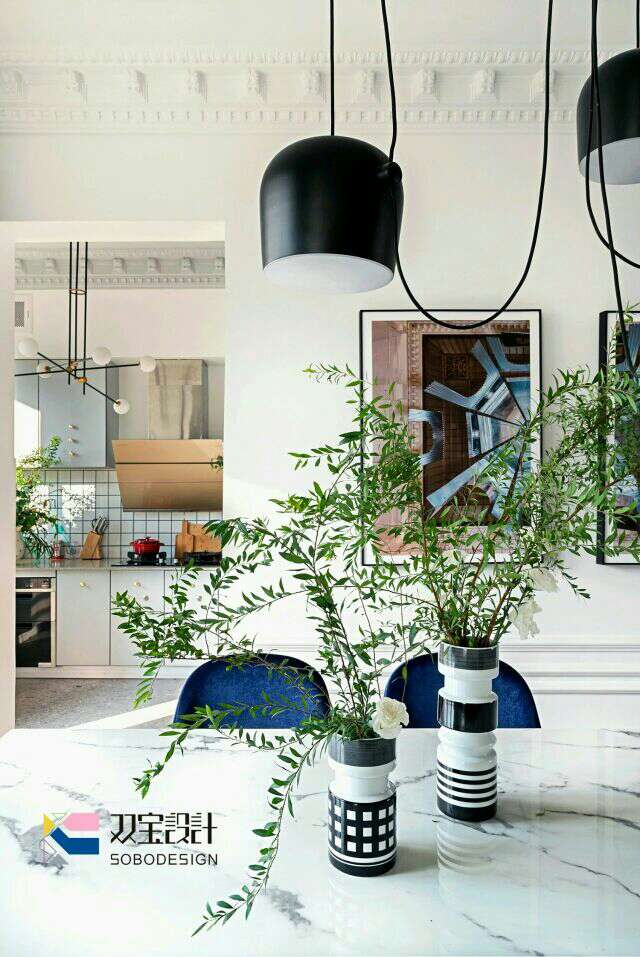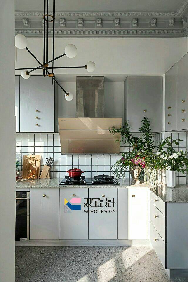 厨房空间采光十足,硬装这次最大的重头戏,是把常规厨房顶上,用来预埋烟道线管的区域(大概从顶吊下来400mm),全部做在了吊柜以上的墙面区域(如图吊柜以上的白**域),保留了层高,又未占任何储物功能,色彩上,保留了墙面的白色,反常规地将顶面做漆,增加了空间的精致感及耐脏性。