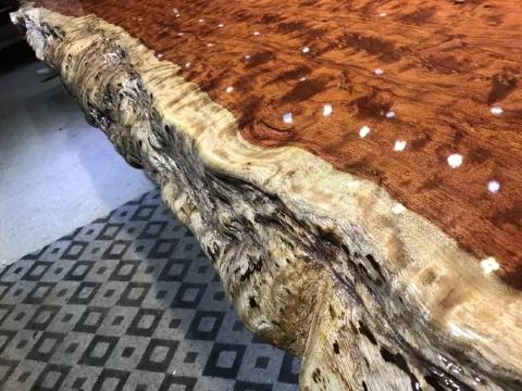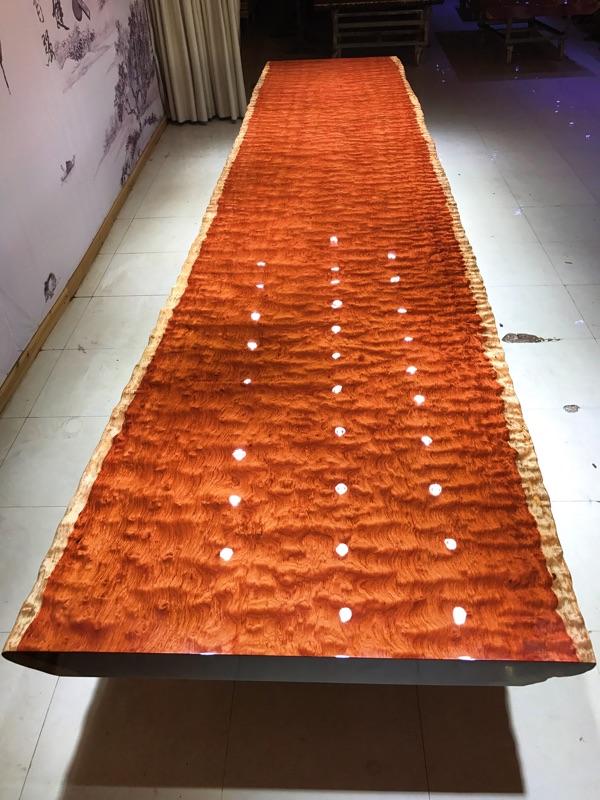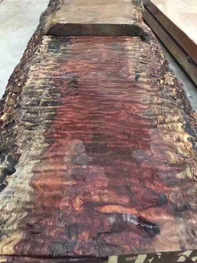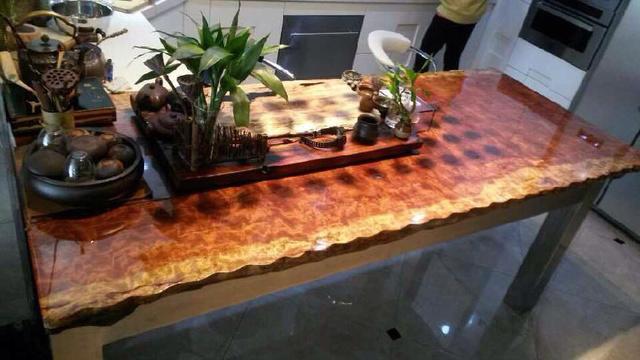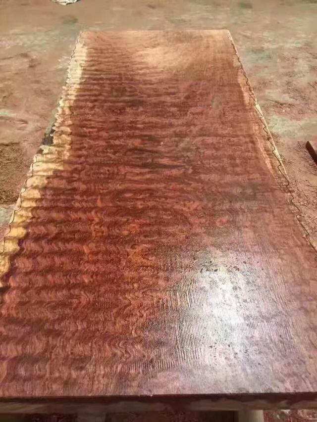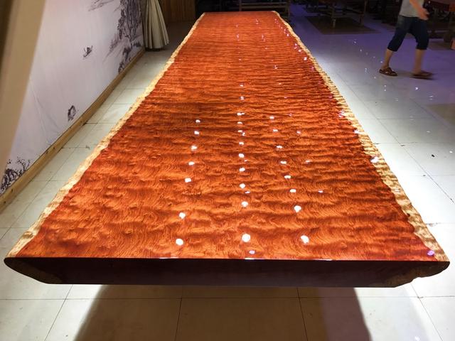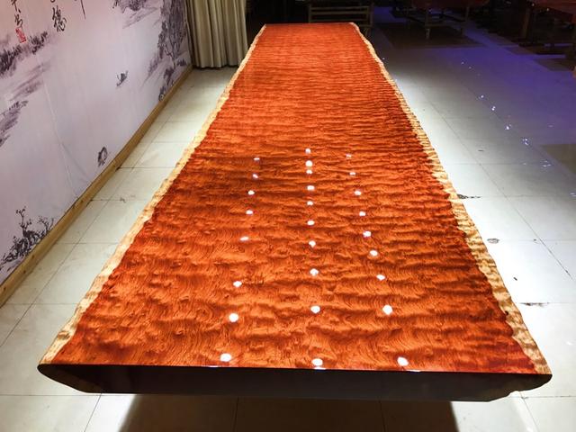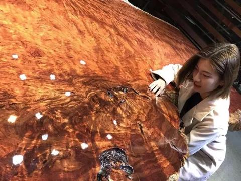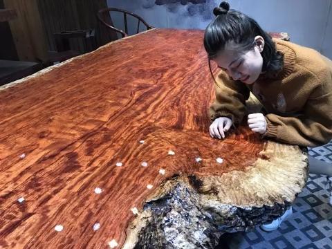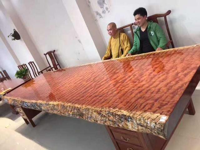这两棵原木买回来时,朱老师特别开心,搬着就轻飘飘的,每次都以为是极品,但是每次切开之后都是绝望。这让朱老师十分受挫。这次他花了20万买了一张巴花桌子,没想到搬过来时十几个壮汉都抬不动。这把朱老师吓住了,满脸愁容的想着该不会又是一张“水泥料”吧。他立即联络了两个人,一个是对家,一个是家具厂。当时他便是在对家看到了这种家具才想要买的,他应该识货。对家家的巴花茶桌。