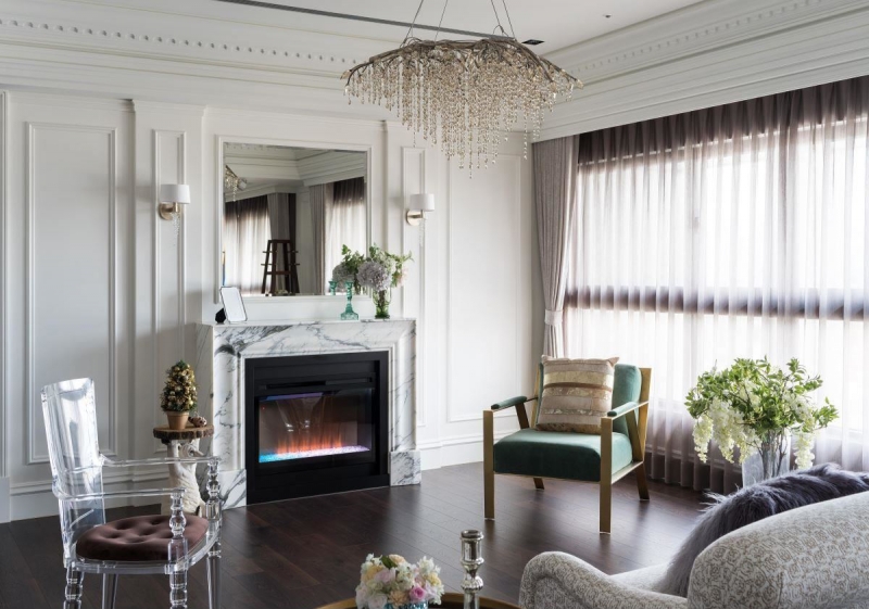 ▲浅色大理石堆砌的壁炉搭配水晶吊灯,呈现法式优雅风情。