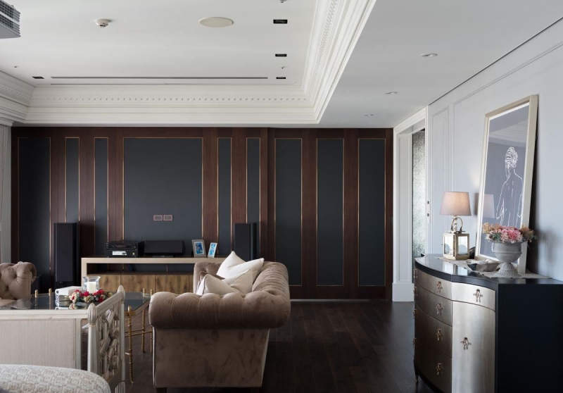 ▲客厅墙面以深咖啡与蓝色调搭配顶级音响设备,高品位生活弥漫着英伦绅士的风范。