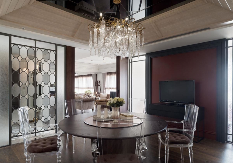 设计师将大宅,客厅、卧室分别划分于左右两边,提升屋主一家的生活品质。入口玄关以独特手工玻璃帷幕,呈现细腻华丽效果与穿透感;客厅则采双客厅设计,电视墙配合顶级音响,以低调深咖啡及灰蓝色搭配镀钛金属线条勾勒视觉美感。另侧墙面则以浅色大理石堆砌壁炉,并以线板工艺呈现女主人的优雅品味;餐厅主墙以黑色与红色调,形成视觉强烈对比,并于上方天花贴上镜面,使空间感受向上延伸。设计师将起居室配置于卧房中心,成为凝聚家人情谊的温馨场所;主卧室则回归舒适自在,透过大幅度留白搭配美式线板,及精美灯饰的点缀,彰显使用者的不俗品味,更以隐藏门藏身专属更衣室,使生活品质再度提升。设计师将国外精髓柔和创新,透过深入了解屋主需求,结合其旅外生活经验,打造令一家人流连忘返的美式优雅生活宅。