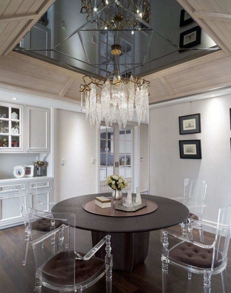 ▲美式屋顶设计利用镜面延伸视觉,垂坠的水晶吊灯拉长空间感,搭配黑与红对比的英伦色调,营造贵族版视觉飨宴。