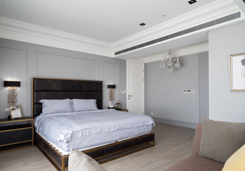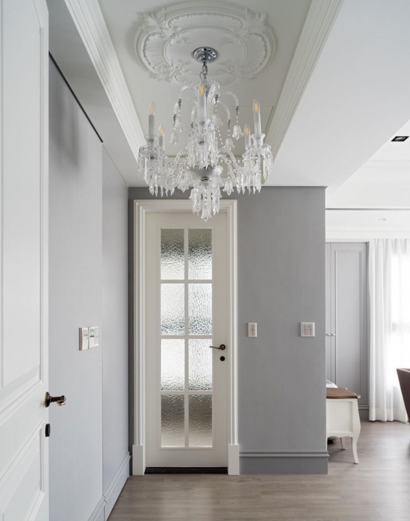 ▲主卧房入口以水晶吊灯点燃一室璀璨,并以低调浅灰色系让空间回归简约舒适,墙面线板设计更精致视觉感受。