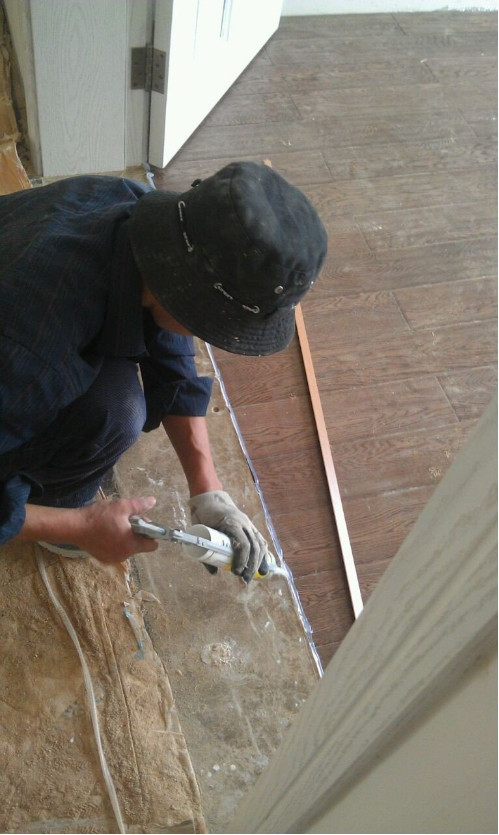 装压条就用玻璃胶沾牢固定,怀疑效果。在我的强烈要求下,踢脚线安装采取的是钉铺和玻璃胶相结合的工艺,这样脚线就比较牢固。