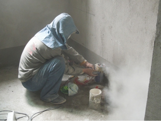 大家总是说,瓦工是最脏最累的活,其实水电也挺不容易的,看,王师傅就带起了口罩和防尘帽,切割机一开,灰尘就蓬勃而出。