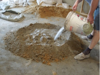 先筛黄沙,在筛好的黄沙山中挖个坑,放入水泥,搅拌。加水,再搅拌。