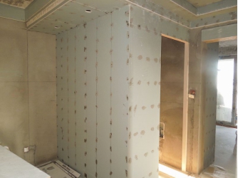 杨师傅铲完墙刷好墙固后,就开始对石膏板上的钉子做防锈处理。