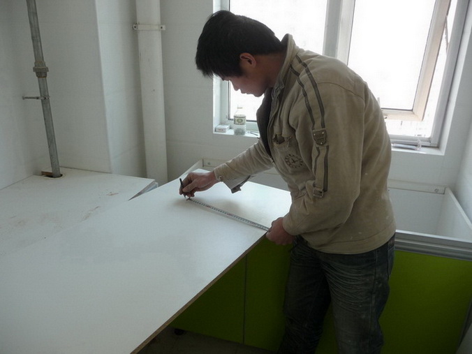 师傅在安装衬板,就是台面下面的整张衬板,这样台面会更结实。