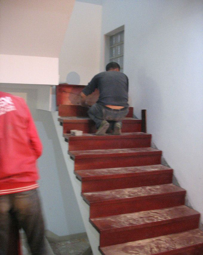 齐家网> 齐家装修论坛> 装修> 楼梯安装:今天大部分时间在钉地龙,至收工,才铺好了9级踏步。