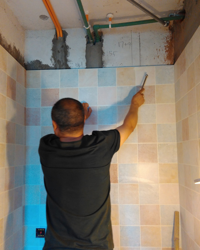 张工拿出小棒槌在瓷砖上大面积的扫描,我问他怎么不一块砖一块砖的敲呢,他说这么做就可以,空鼓的砖声音会变得响的明显~~