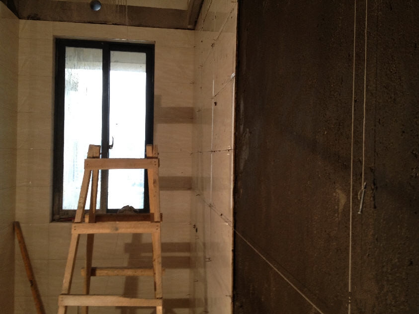 贴墙砖的时候先打好线,然后小徒弟往瓷砖上涂抹水泥,师傅上墙,呵呵。