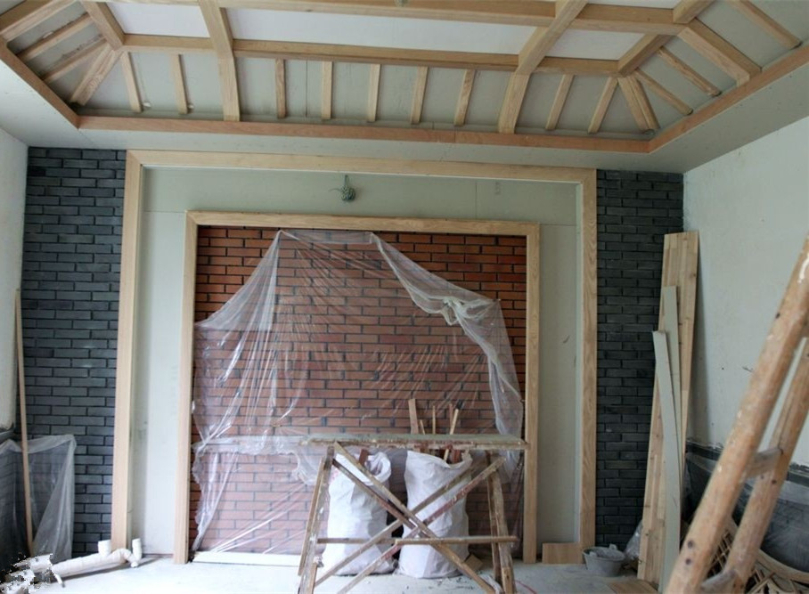电视背景、护墙毛砖贴好了,待另请工人来勾缝。