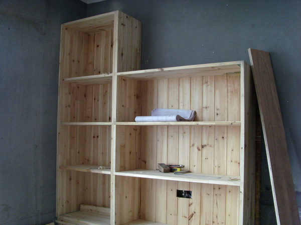 不过木工师傅手艺不错的,动作也快的。一个书柜一个大衣柜已经树立起来了。