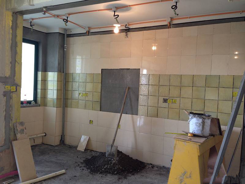 柜后砖是吴师傅的小徒弟贴的,稍微有一块不整齐,但是以后要放不锈钢板子,所以可以接受啦。