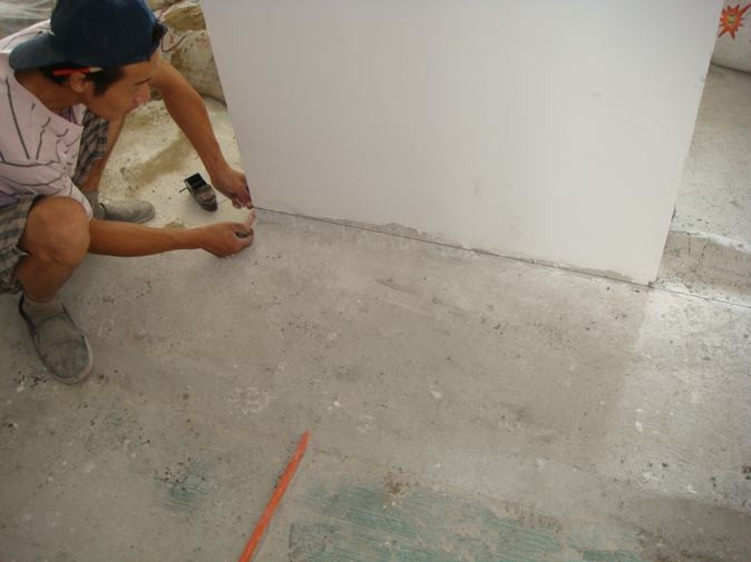 贴砖的水平鲍经理已打好,瓦工确定贴完地砖的高度。