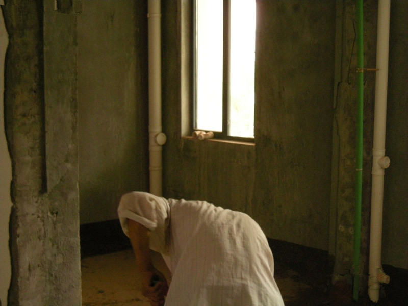 咱上楼看看。厨房和卫生间的墙已经没了,工人还在做收尾工作,我站了一会,想拍下工人辛苦破坏的动作。