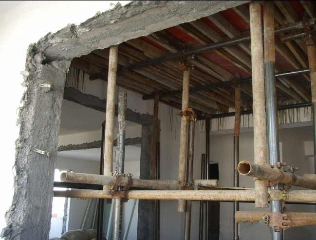 齐家网> 齐家装修论坛> 装修> 客厅里有二个做楼层加固的工人在搭脚手架,还有二个工人在运送垃...