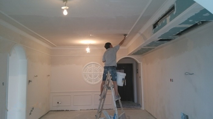 今天一去工地,就看见漆工在奋力工作中~木作的面漆已经做完了,现在在开始做墙面第一遍腻子了~