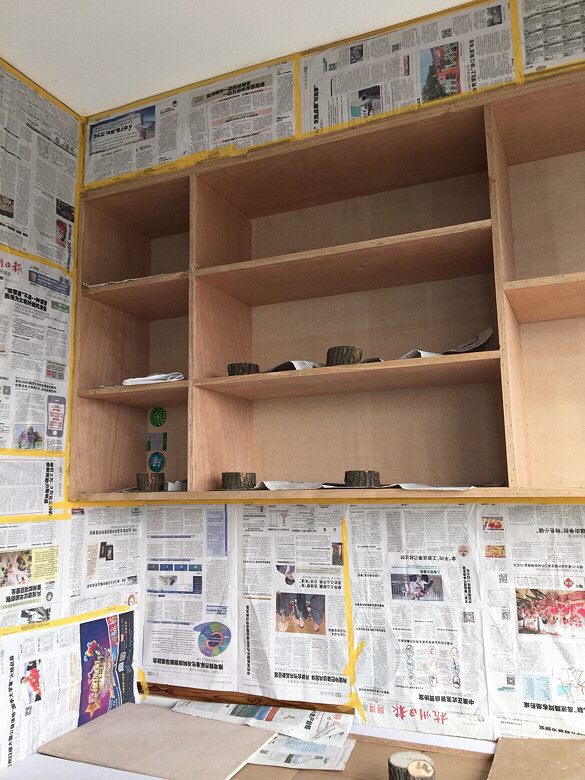 阳台的吊顶还要铲上面的老粉,再重新做油漆,所以油漆师傅要我们给阳台做下保护,自已动手贴报纸。