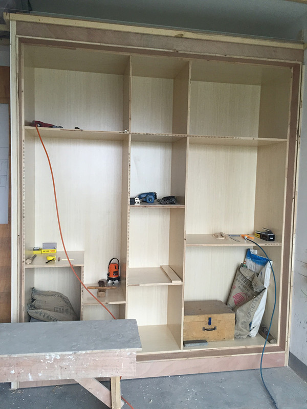 周末过去转转,发现大衣柜已经打好并且立起来了,感觉好OK哦~黄师傅感觉总是笑嘻嘻的,还跟我们说“有空多来转转啊”。