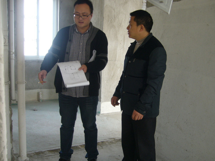 齐家网> 齐家装修论坛> 装修> 项目经理小顾和瓦工郑师傅在讨论卫生间墙排砌墙的事呢。