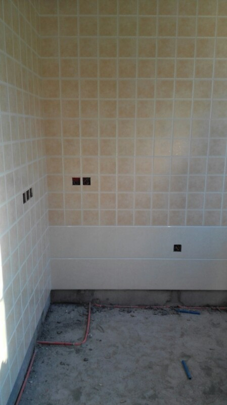 三伏天,但我家师傅的干活热情丝毫不减。。。早上瓦工开始贴砖,下班一看,厨房墙面已完工了,下面白色的是汇亚送的杂砖。