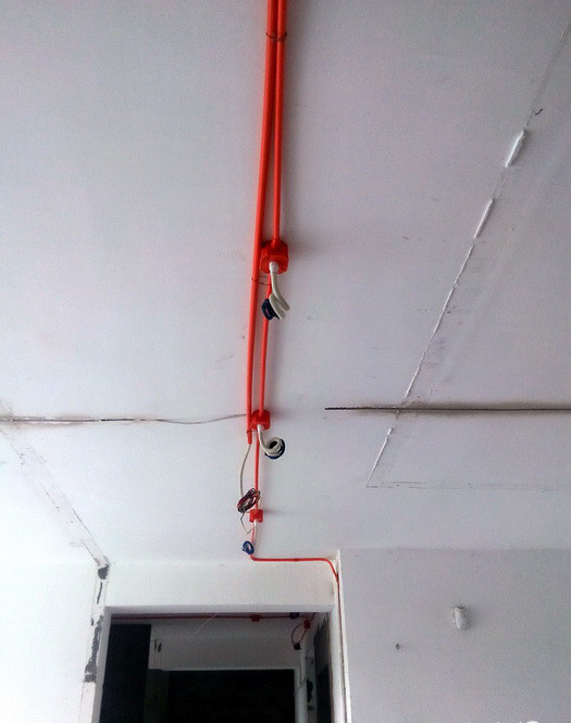 客餐厅之间的天花上留给大金卡机的电源,4平方的线。客房挂墙电视的线管以及机顶盒搁板上的插座。