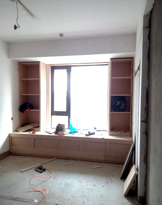钟小安房间的飘窗书柜雏形已出,书架最下面一格是抽屉的位置。接下来就等着贴饰面板,钉线条了。