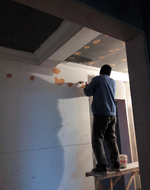 今天贴石膏线也开始了,天花上一块一块的褐色就是油漆师傅涂上的钉子的防锈漆。