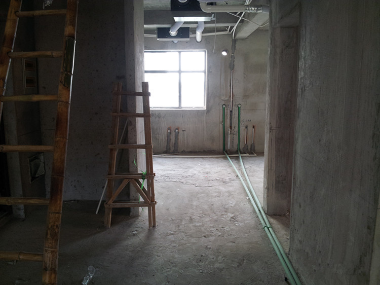 客厅看向厨房餐厅方向,左边是入户门,门口的鞋柜已经预留出来了。