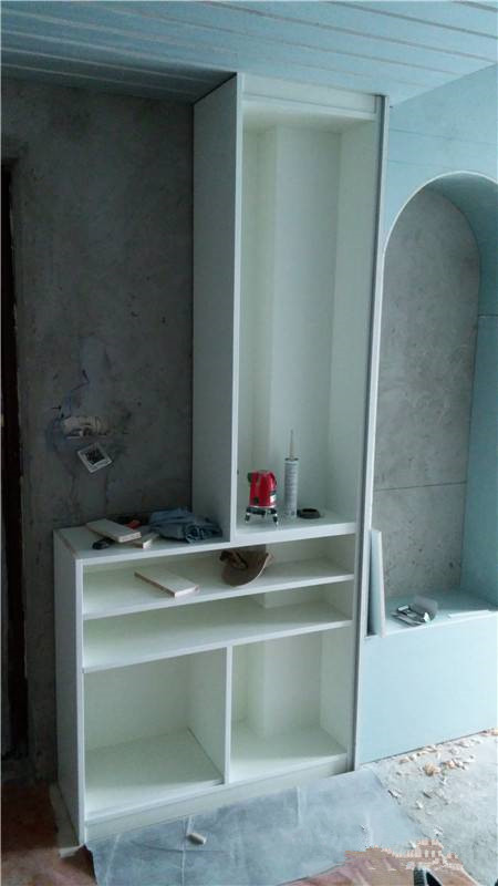 进门的鞋柜,矮柜的台面到时会有点小花样~暂时保密~高柜包了个水管。